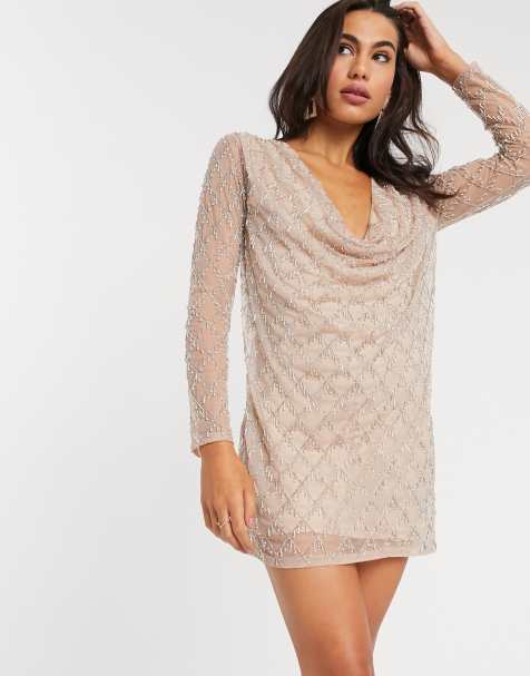 Asos Mink Nude Pink Sequin Embellished Mesh Skater Party New Dress Size 10 12 Ebay
